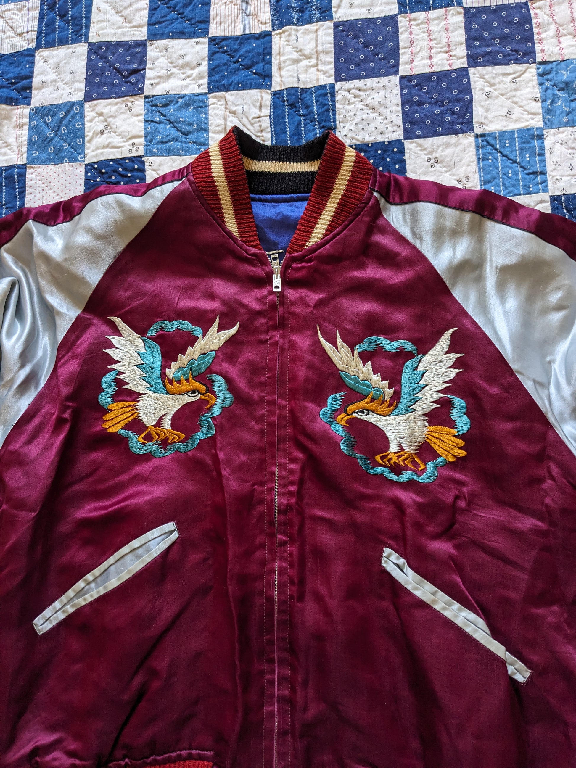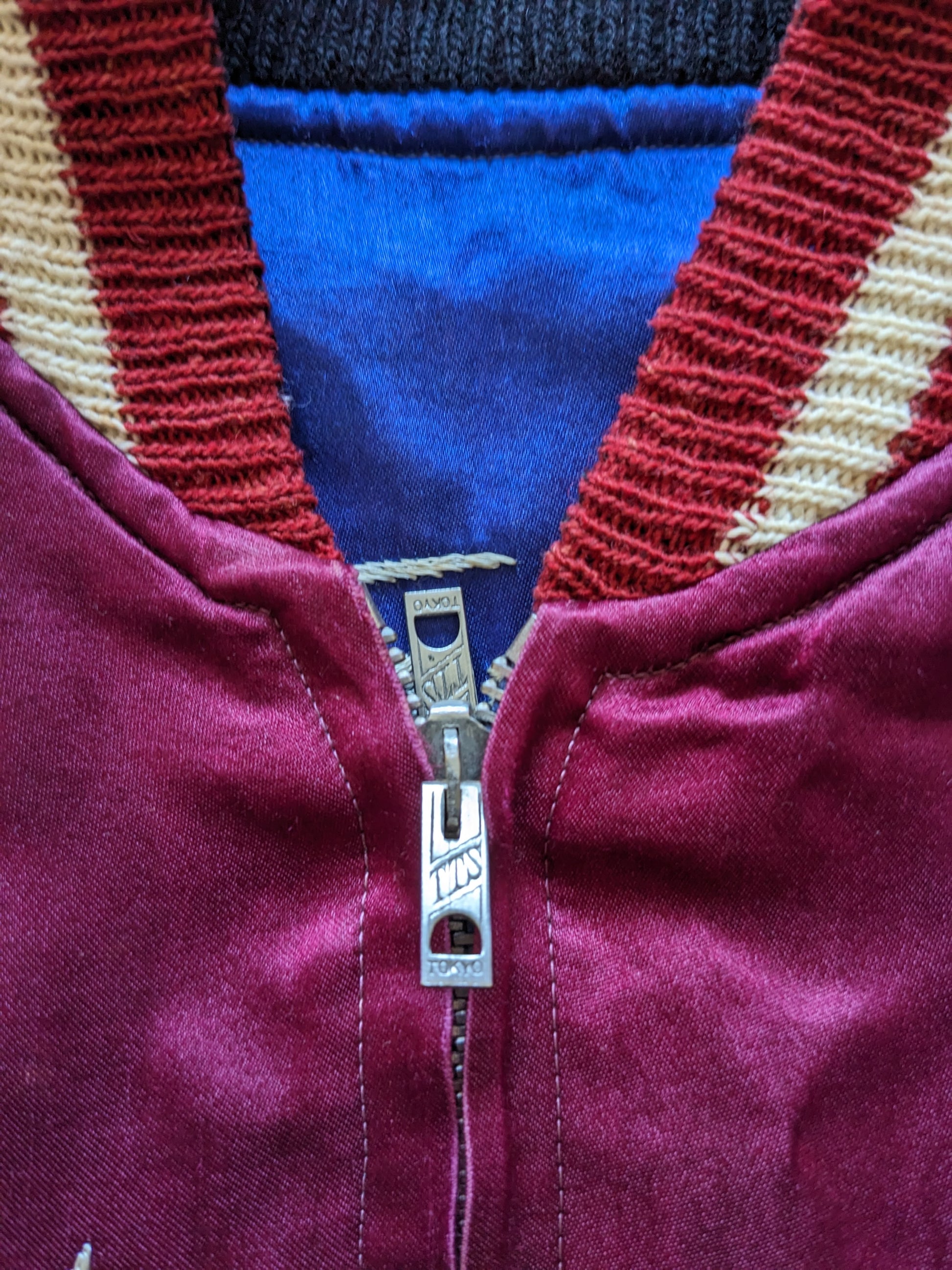 An original souvenir jacket, typically brought back by American military personnel stationed all over the world post WW2. This one features a tigers, falcons, and a map of Korea.